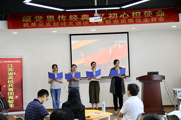 为了庆祝中国共产党成立99周年,在支部党员中持续深入的开展理想信念教育,7月1日下午,机关三支部在青智库活动室举办了“颂党恩传经典,忆初心担使命” 诗文诵读大赛暨党员集体生日会。副校长杨雪琴、纪委书记徐浪、党委宣传部长刘文平、关工委秘书长王怀宝等应邀出席了本次活动。