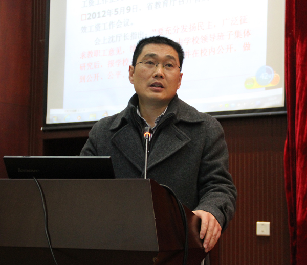 财务处处长黄美娟作了学校财务工作报告;工会主席常华作学校工会工作报告和工会经费简报,并就三届四次教(工)代表大会的提案及合理化建议进行回复及说明,通报了三届五次教(工)代表大会的提案及建议汇总情况;人事处处长奚小网、教务处处长孙燕华分别向到场代表介绍了《永利集团304am登录绩效工资实施办法(讨论稿)》和《教学部门教学编制核算办法(讨论稿)》。