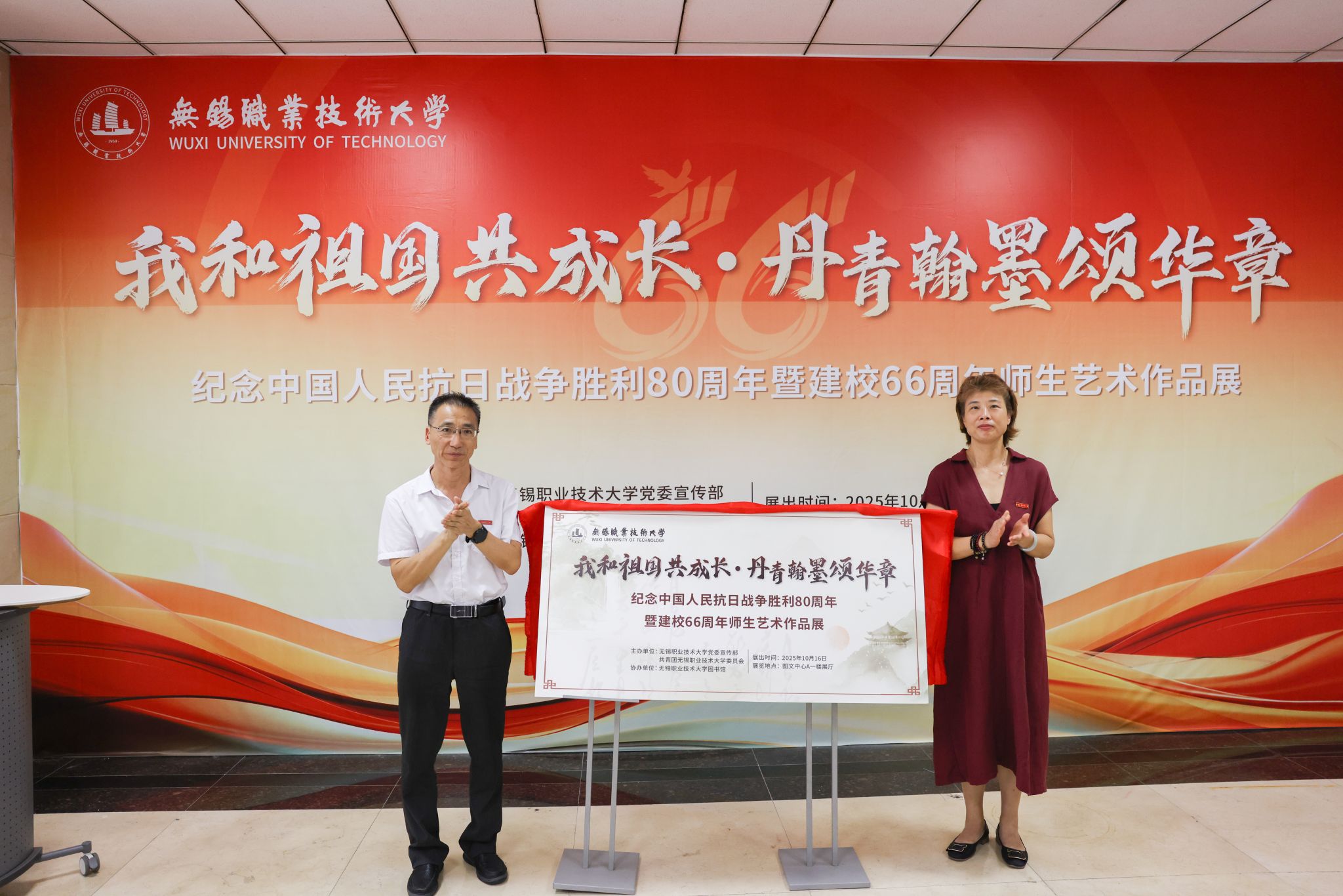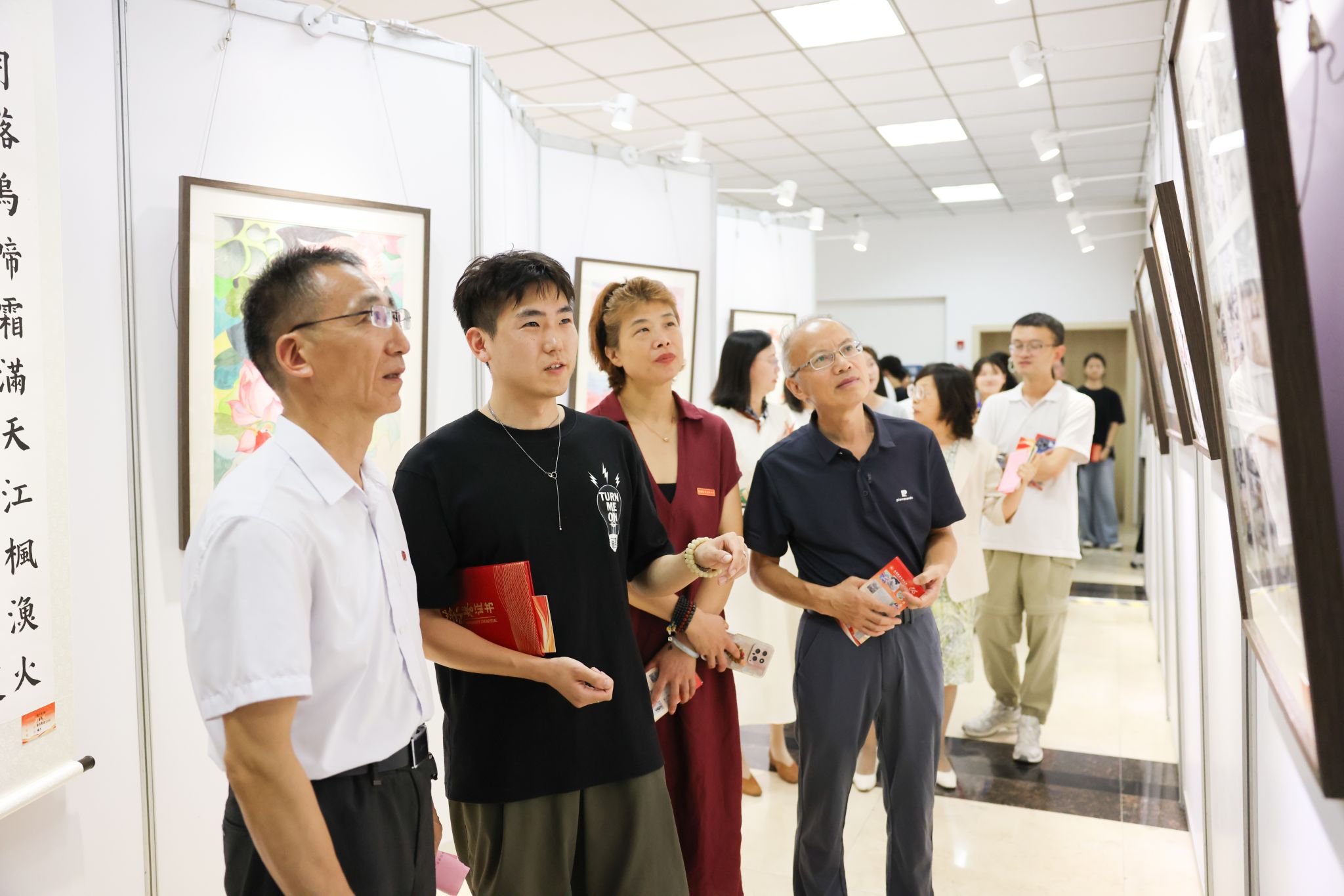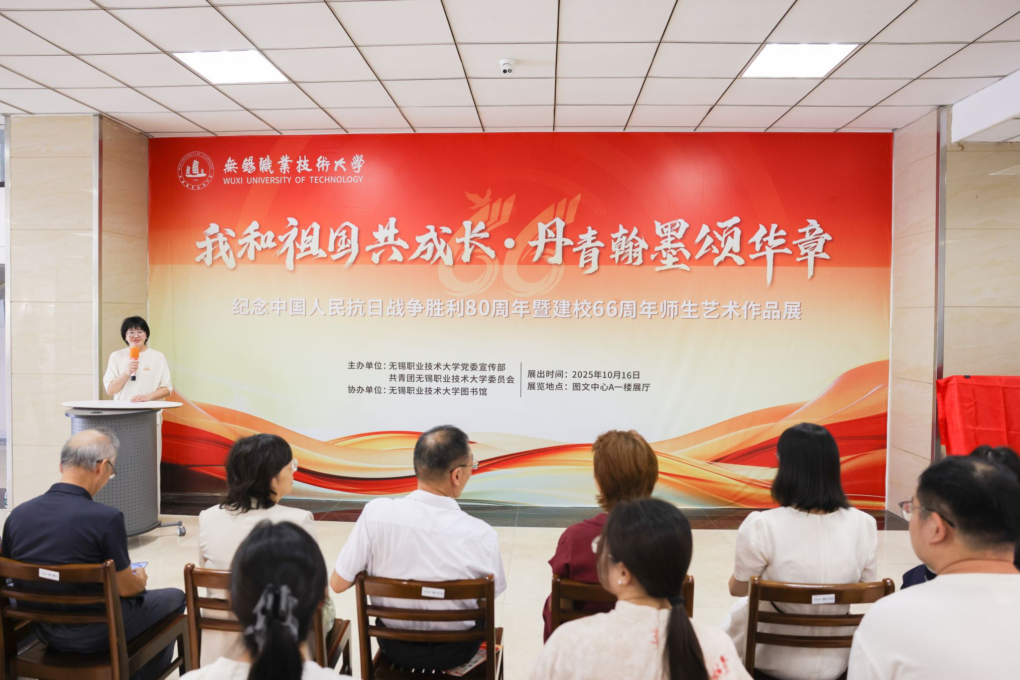 时值中国人民抗日战争胜利 80 周年,10月16日下午,“我和祖国共成长 丹青翰墨颂华章”师生艺术作品展在图书馆一楼开幕,学校党委书记龚方红和相关职能部门负责人参加开幕式。