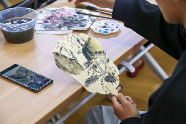 活动伊始,曹亮为大家展示了《千里江山图》的印刷版本,让在场的师生有了更直观的感受,大家都惊叹于画作的雄浑壮美。接着,从画作的朝代背景、作者生平、绘画所用的材料以及观赏细节等方面进行了深入浅出的讲解,让师生在欣赏画作的同时,了解中华文化的博大精深。曹亮还从挑选扇面图案、调配颜料、落笔勾色等方面讲解了扇面画的绘制技巧,引导大家沉浸式体验中国扇面画创作全过程。在了解绘画团扇的基本技法和要领后,大家拿起毛笔,用临摹与创作的方式绘制扇面,一幅幅扇面在一支支画笔的渲染勾勒下,逐渐变得各有特色,完全沉浸在扇面画的创作过程中。