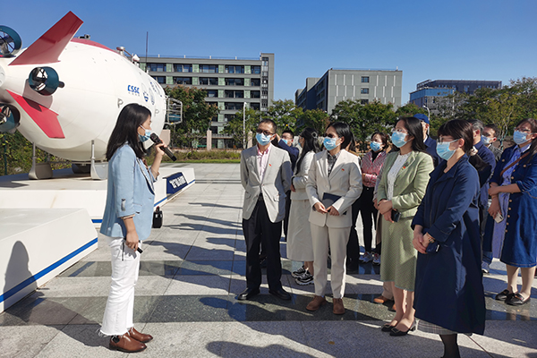 在深海潜水器模型广场,研究中心办公室副主任王丹详细介绍了大国重器——蛟龙号、深海勇士号、奋斗者号的研发历程、功用和价值;在深海技术科学太湖实验室展览馆,大家了解了实验室的建设背景、建设目标任务,建设内容,面对我国深海技术领域的多项创新成果赞叹不已。在观看奋斗者号潜水作业视频的过程中,所有人都被科技研发及作业人员刻苦严谨、勇于担当、无私无畏的品格深深打动。在参观现场,大家一起重温了习近平致“奋斗者”号全海深载人潜水器成功完成万米海试并胜利返航的贺信,对总书记提出的 “严谨求实、团结协作、拼搏奉献、勇攀高峰”的中国载人深潜精神有了更深刻的理解和感悟。此行大家还走访了大型操纵性耐波性水池实验室。