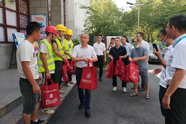 连日来,无锡地区持续高温。8月1日上午,强伟纲副校长深入宿舍,看望在酷暑中持续施工的校内外人员,感谢大家用辛勤汗水为学校智慧校园建设发展做出的贡献,并代表学校给各施工队发放了矿泉水、藿香正气水和毛巾等慰问物资,要求各家在保证施工质量、进度的同时,注意安全,做好防暑降温工作。