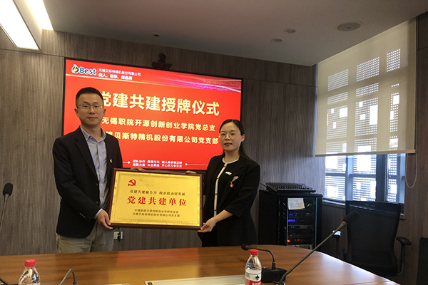 随后,开源创新创业学院党总支副书记朱倩与无锡贝斯特精机股份有限公司党支部书记陈斌代表各自党组织举行了“党建共建单位”授牌仪式。双方一致表态发挥党建引领,以此次党建共建为契机,围绕人才培养、服务学生高质量就业、联合开展主题党日活动、联合开展技术研发与培训、联合开展课题研究等方面优势互补、合作共赢,构建大党建工作格局。