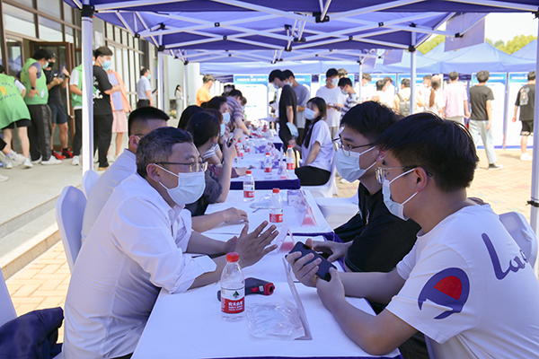 校长龚方红在现场与毕业生及工作人员深入交流。他介绍,此次活动是学校与滨湖区人社部门联合用人单位开展就业面试直通车活动,活动深入挖掘了学校智能制造特色校的专业优势及滨湖智能制造企业的用人需求,想学生之所想,急企业之所急,做好双方的精准对接及服务。这是学校在疫情防控的背景下访企拓岗促就业、服务地方经济发展的一次创新尝试,目的就是想尽千方百计为毕业生搭建更快捷、更高效、更贴心的求职通道,促进学校毕业生好就业、就好业。