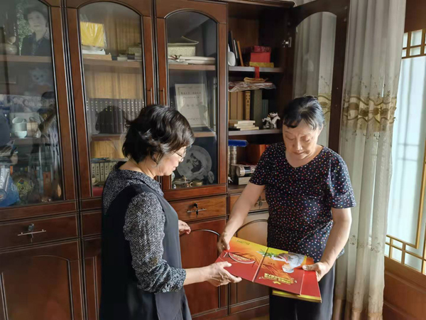 傅筠老师(右)向图书馆馆长韩冰介绍个人藏书
