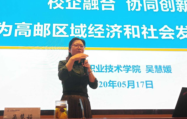 对话活动由校企合作处副处长饶成明主持。吴慧媛副校长《校企融合、协同创新,为高邮区域经济和社会发展赋能》的专题报告从学校办学情况、技术积累情况、社会培训情况及校企合作目标方向等四个维度向参会企业家作了全面介绍。她表示,高等职业教育的功能之一就是为地方经济发展服务,无锡职院将根植企业,面向区域,深入扬州高邮广泛开展调研,解决企业“痛点”问题,把“无锡职院—扬州高邮”校企合作做成“乡镇企业技术支持服务”的典范。