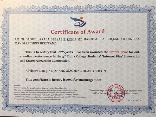 中国互联网+大学生创新创业大赛是由教育部主办的大学生双创类的顶级赛事。今年,由学生工作处朱佳艺老师和国际教育学院张晓明老师指导的,由中外留学生联合组队开展创业实践的项目《CHN JOBS》(项目负责学生:AMINI DAOUD)一路过关斩将闯入国赛,并取得了全国铜奖的成绩,这是永利集团自2015年组队参赛以来的第一个全国获奖项目。