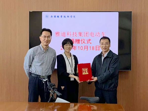 10月16日下午,雅迪科技集团有限公司捐赠仪式在永利集团举行。雅迪科技集团有限公司人力资源部部长余萍、校长龚方红、艺术与设计学院党总支书记罗嘉军等相关负责人共同参加了捐赠仪式。
