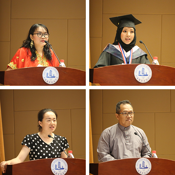 朱爱胜书记在毕业贺词中向2019届留学生毕业生顺利完成学业表示祝贺,鼓励毕业生用所学的知识与技能为自己国家的发展作出贡献,努力成为国际友好传播使者,促进中外文化交流。马来西亚管理与科学大学副校长Eddy Yusuf先生、印尼特里萨克迪运输与物流学院副校长Juliater Simarmata先生对同学们顺利完成学业表示祝贺,并高度认可永利集团的外国留学生培养工作,就进一步加深与永利集团稳固的合作表达了意愿。吴慧媛副校长宣读了优秀毕业生、结业生、毕业生的相关决定。龚方红校长为毕业生一一行拨穗礼、颁发毕业证书、赠送纪念品,并合影留念。