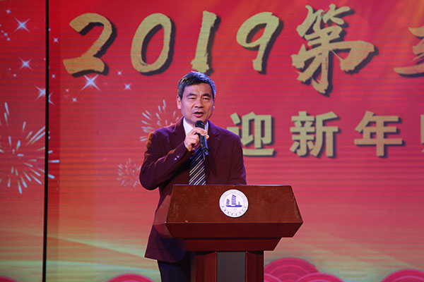 演出之前,校党委书记朱爱胜代表学校党委和行政向全校师生员工致新年贺词。朱爱胜书记指出,刚刚过去的2018年,我们伴随着伟大祖国在新时代前进的最强音,学校发展再上新台阶,胜利召开了第四次党代会,吹响了“建设领军全国的智能制造特色校、创建特色鲜明的高水平应用技术大学”的前进号角。这一年,我们的教育教学改革成果丰硕,科研服务水平持续提升,学生服务工作成绩显著,师资队伍建设取得突破,国际影响力持续扩大,文化建设不断增强。2019年是承上启下、继往开来的关键一年,我们要以学习贯彻习近平新时代中国特色社会主义思想为首要政治任务,深入贯彻落实党的十九大精神和学校第四次党代会精神,进一步解放思想、深化改革、对标补差、创新发展,坚定不移把新时代永利集团304am登录推向前进。