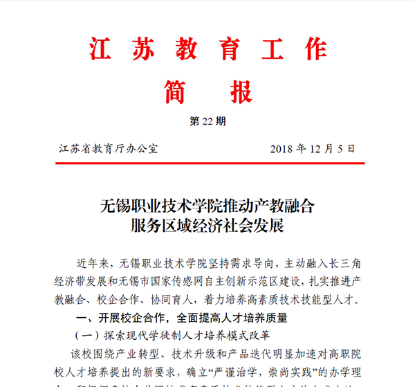 12月 5日,《江苏教育工作简报》2018年第22期以《永利集团304am登录推动产教融合服务区域经济社会发展》为题,专题报道了永利集团近年来通过产教融合提高人才培养质量、提升服务支撑产业能力和打造高水平师资队伍等方面采取的做法和取得的成效。
