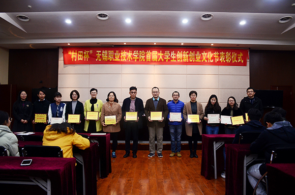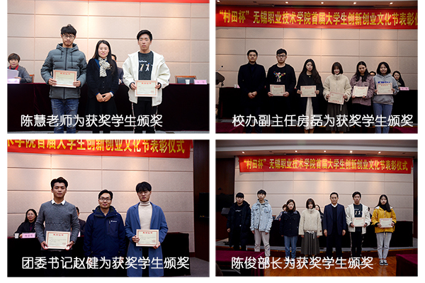 表彰仪式由徐悦副处长主持。她首先介绍首届大学生创新创业文化节的基本情况。本届活动包括:“大学生创新创业大赛”、“创业实训学堂”报告会、“母校有约”校友分享会、“实习归来话成长”主题报告会、“校园营销大赛”、“大学生创客秀”、“校园双选会”、“寻访无锡民族工商足迹”征文比赛和“职业生涯规划大赛”等多个系列活动。随后她宣读了《首届大学生创新创业文化节获奖学生的表彰决定》。与会领导老师向获奖学生代表、优秀指导老师代表和获得优秀组织奖代表进行了颁奖。控制技术学院供热空调21632卢文科同学代表获奖学生发言,他感谢学校为同学们提供的创新型平台,并表示在未来的大学生活中,一定利用专业知识,抓住发展机遇,成就创新创业梦想,并呼吁同学们行动起来,为自己的明天努力奋斗。