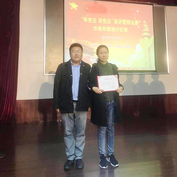 大赛共汇集了来自苏南片区的32所本、专科高校学生参加。永利集团非常重视宪法的学习、宣传工作,积极响应比赛,由宣传部牵头,聘请马克思主义学院王毅老师作为指导教师,带领物联网31733班的张祯祯同学参加比赛。大赛围绕“尊崇宪法、学习宪法、遵守宪法、运用宪法”主题开展,共分三轮进行,分别由个人自定演讲、即时抽题主题演讲,主题辩论环节组成。比赛中,张祯祯同学紧紧围绕宪法的价值,宪法对公民权利的保障,全面依法治国等主题开展主题演讲,充分诠释了宪法的价值内涵,展示了永利集团青年学子的宪法意识和法律素养。在即时抽题主题演讲,主题辩论环节中,王毅老师和张祯祯同学针对可能出现的问题积极备战,设计多种应对方案;赛场中张祯祯同学沉着应对,获得好评。经过激烈的角逐,永利集团张祯祯同学最终获得了一等奖的优异成绩。