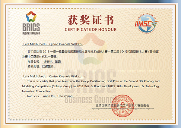 7月5日至8日,2018一带一路暨金砖国家技能发展与技术创新大赛——第二届3D打印与智能制造技能大赛在内蒙古赤峰市举行,来自中国、南非、俄罗斯、印度、奥地利等10个国家的中外技能选手参加决赛。永利集团南非留学生组成的代表队从众多参赛队中脱颖而出,获得3D打印技术大赛一等奖。