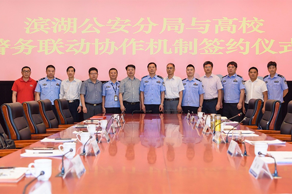 为进一步加强公安机关与辖区高校的警务联动协作,构建校园安全防控体系,全力维护高校平安稳定,5月30日上午无锡市公安局滨湖分局召开“滨湖公安分局高校安保工作联席会议”,周桂瑾副校长出席会议并与滨湖公安分局签订了《警方与高校警务联动协作机制协议》。