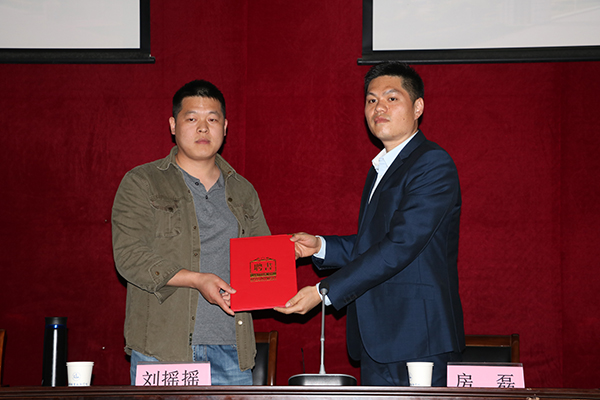 房磊代表学校向刘摇摇校友颁发兼职讲师聘书