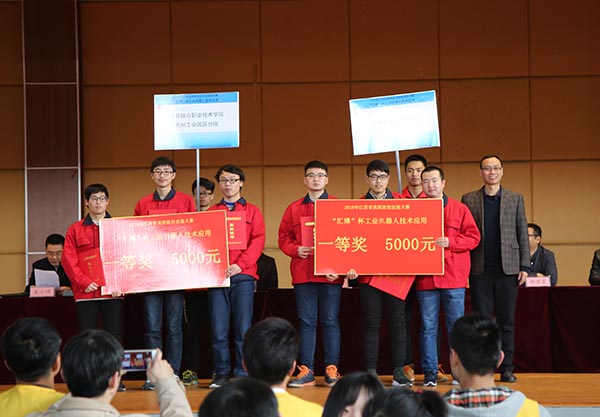 工业机器人技术应用赛项则要求选手完成机械和电气安装、视觉系统编程调试、工业机器人系统编程调试、工业机器人系统模块调试以及系统综合编程调试等任务,最终评出一等奖2名、二等奖4名、三等奖6名。该赛项较去年相比内容难度增加,平台更为开放、系统功能更加完整,也更接近工业实际的应用特点。永利集团参赛队自去年选拔优秀学生参与集训,最终由陆荣、丁健老师指导的王军、聂阳和姜鑫同学代表学校出征,比赛当天现场发挥出色,夺得第一名,与江苏联合职业技术学院苏州工业园区分院共同获得一等奖。