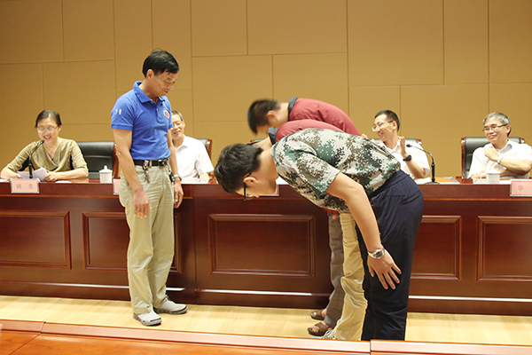 当天的表彰大会上,还举行了一个简单而隆重的收徒仪式,永利集团特聘兼职教授、中船重工七〇二所蛟龙号载人潜水艇首席装配钳工技师顾秋亮正式将两位专业教师和一名学生收为徒弟,并以自己的座右铭谆谆教诲:“我的工作无差错,我的岗位请放心!”