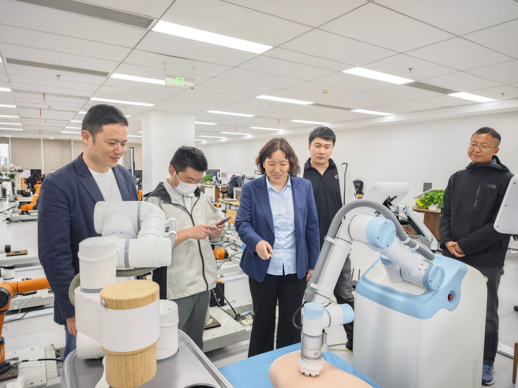 随后,调研组来到遨博智能科技有限公司,参观了企业展厅,详细了解具身智能机器人在工业装配、医疗辅助、农业自动化等领域的创新应用。座谈会上,段莉华介绍了物联网学院在人工智能等专业的发展规划,并就专业建设、校企合作等方面展开探讨。