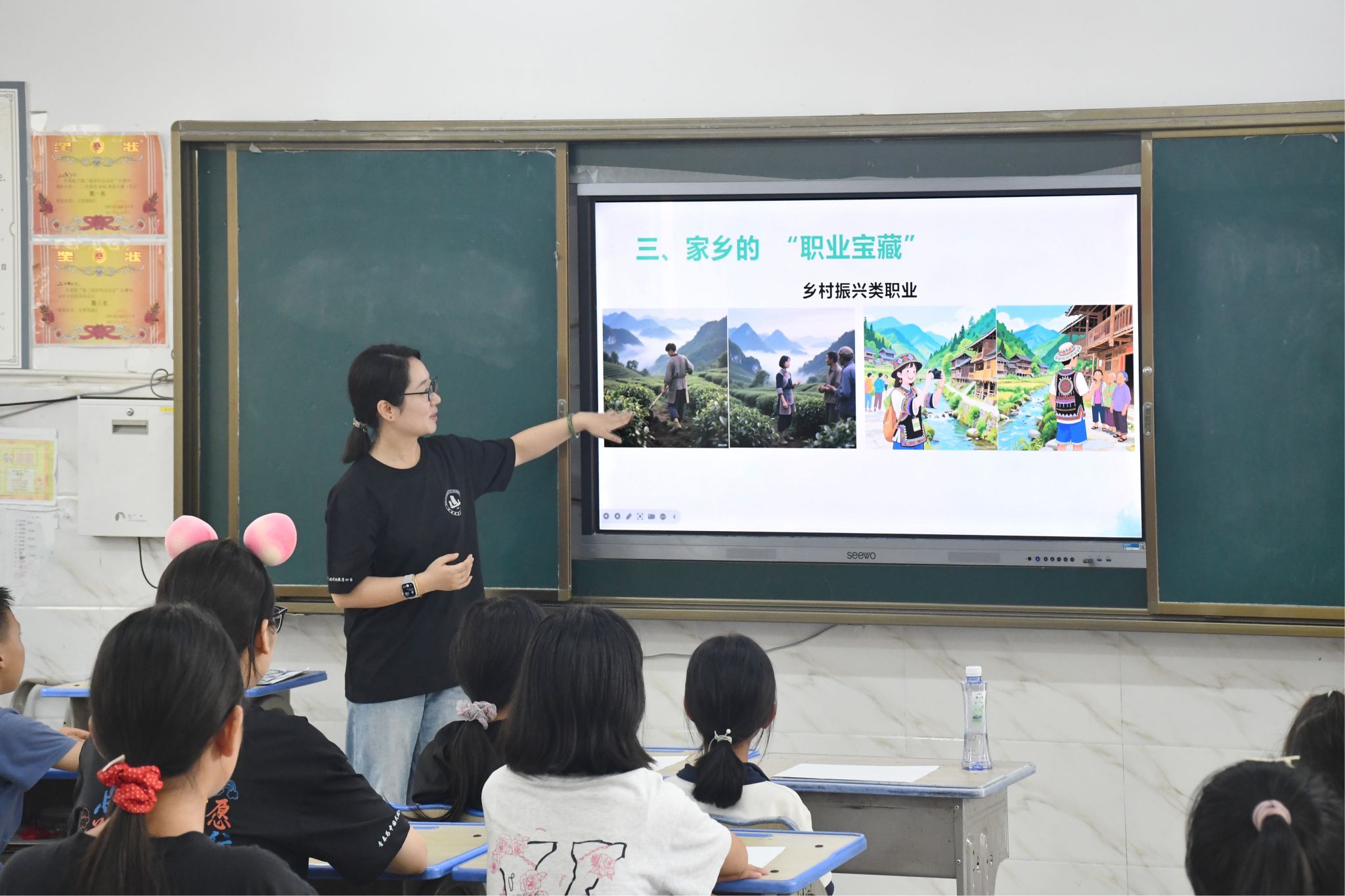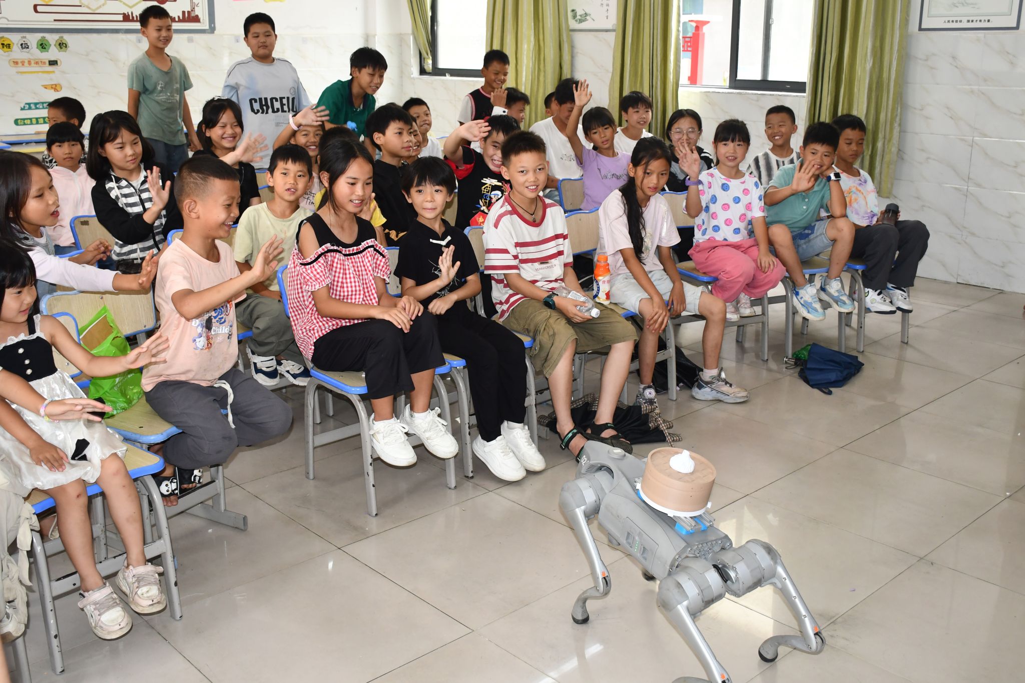 职业体验课上,指导老师周嫄根据关岭县的实际情况,用AI生成了医生、苗族银匠、智能制造系统工程师、城市轨道交通工程师等职业体验卡。让孩子们在重新认识家乡的独特职业的同时,又打开了一扇望向远方的窗。机器狗笨笨的出现,更是引起了轰动,它背着用3D打印的笼屉,为孩子们送去礼物,与孩子们在操场上互动,让科技改变生活在此刻具象化了。“我们希望通过这些特色课程,在孩子们心中种下梦想的种子,让他们知道外面还有更广阔的世界等着他们去探索。”周嫄说。