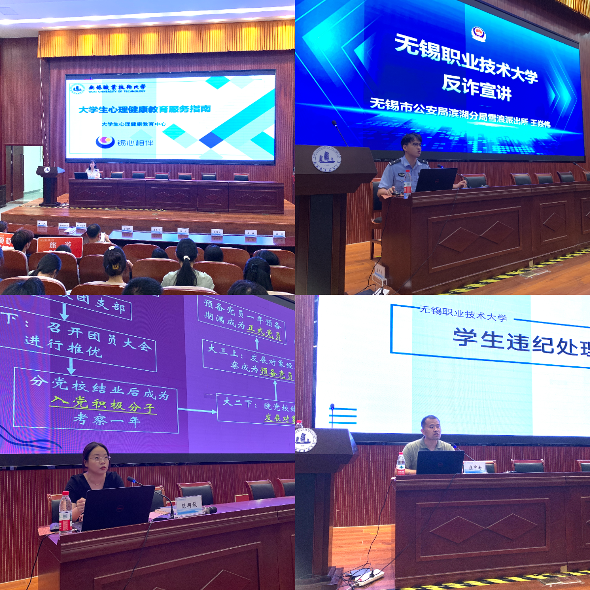 新生见面会结束后紧接着开展了入学教育,邀请了无锡公安局滨湖分局的王警官、文旅学院丁远老师、陈明媛老师、庄中南老师分别进行了安全反诈教育讲座、入学心理适应及调适、党团知识介绍、校规校纪解读和疾病预防教育。
