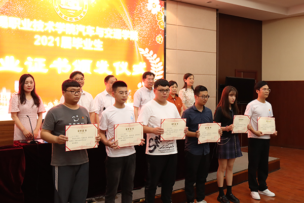 毕业典礼上,汽车与交通学院党总支书记邹晔宣读了汽车与交通学院2021届毕业生毕业情况,党总支副书记丁正荣宣读了2021届优秀毕业生名单,主席台领导为优秀毕业生颁发了荣誉证书,并为毕业生代表颁发了毕业证书。