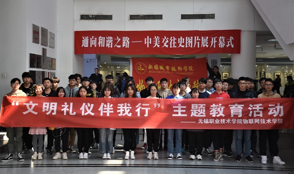 为弘扬锡职主题教育优良传统,在学生中营造文明礼仪好风气,3月25日下午,物联网技术学院赴无锡市图书馆开展了一次“文明礼仪伴我行”主题教育活动。五十余名同学在物联网分团委刘雄老师带领下,在无锡市图书馆参加由无锡市人民对外友好协会主办、无锡市图书馆承办的“通向和谐之路——中美交往史图片展”活动。