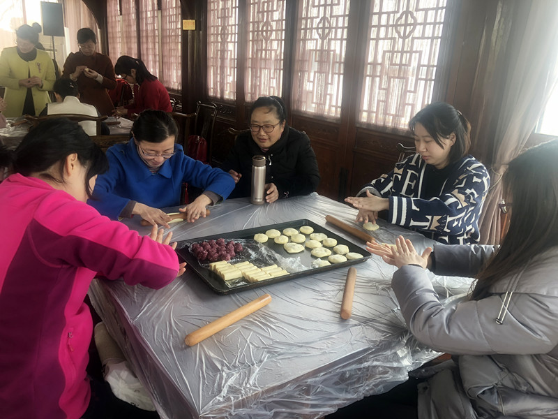 随后,在点心师傅的指导下进行做玫瑰花饼的活动。女教工们纷纷撸起袖子,用多层酥皮和玫瑰花馅,制作出了芬芳四溢的玫瑰花饼。游园、品茶、做鲜花饼,活动很快在欢声笑语中进入了尾声,大家捧着自己的劳动成果,内心成就感满满。