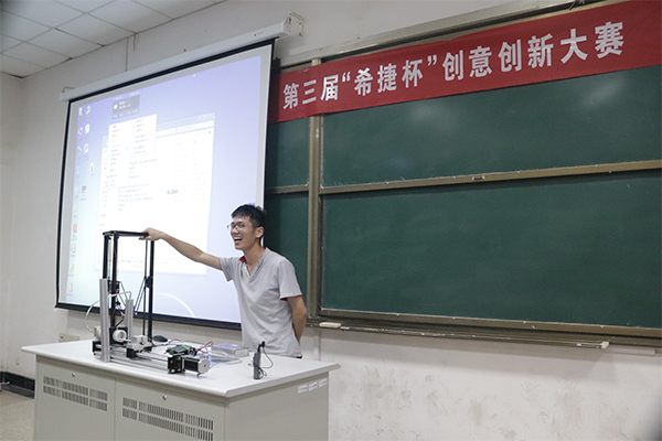 参赛选手按照顺序轮流上台展示自己的创意发明,并作简要说明。大赛展示了智能黑板机器人、流水型3D打印机、蓝牙模块U盘、液压机械手臂,模块化路由器等形式多样,功能各异的作品。发明独出心裁,精彩纷呈,得到台下评委和观众的喝彩,比赛现场气氛热烈,全体同学观看有序。经过最终评选,一等奖获得者为机器人21631班的陈虎与李亮亮。大赛结束后由分团委庞军老师对本次比赛进行点评分析。