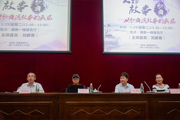 活动中,刘鹏春老师以《人物 故事 歌舞——以歌舞演故事的我见》为主题,给同学们做了精彩讲座。他运用丰富的戏剧歌舞案例,深入讲解了歌舞对于戏剧故事阐述、歌舞对于戏剧人物性格的表现方式,并剖析了歌舞表演在现代戏剧中存在的“戏不够、歌舞凑”、奢华虚浮倾向等误区,提出了探索载歌载舞的生动与有滋有味的思考结合、浪漫主义与现实主义结合提升歌舞感染力的个体感悟,他期待艺术家能够深入生活,不断脚踏实地勤学苦练,创作出更富生活气息和时代特色的精良作品。刘鹏春老师对戏剧剧本的广泛涉猎、对歌舞表现形式的深刻认识、语言表达的优美深邃,得到全体师生的广泛赞誉。