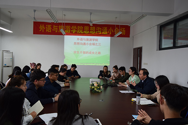 4月24日下午,在国际交流中心604会议室,外语与旅游学院针对学生干部工作中遇到的困难开展了主题为“学生干部的成长之路”思想沟通小会场。外语与旅游学院党总支书记江铭、学工办主任周嫄、辅导员林姣姣、学生会学生干部代表和班级学生干部代表参加了此次活动。