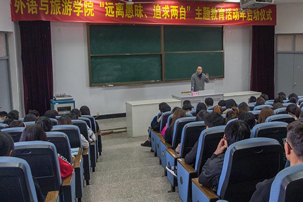 3月13日下午,外语与旅游学院在博学楼102报告厅举办2018年“远离愚昧、追求两自”主题教育活动年启功仪式,分院党总支书记江铭,学工办负责人、辅导员、班主任老师和2016、2017级全体同学参加了活动。