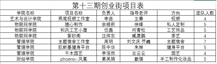 根据公告栏《关于继续征集大学生创业街创业项目的通知》要求,经学生本人(团队)申请、院系推荐、专家初评、现场答辩、学校审核等环节,现拟定“燕尾视频工作室”等8个项目为永利集团大学生创业街第十三期入驻项目,现予以公示。